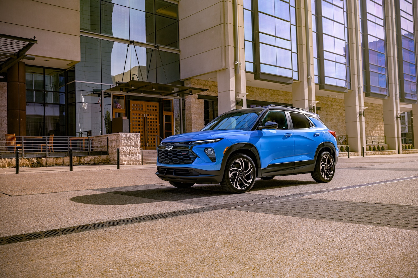 The 2024 Chevy Trailblazer has angular lines, creased sides, and chiseled fenders that make it easy on the eyes. Blacked-out center roof pillars and a huge C-pillar give it a "floating roof" look. A mesh grille, thin headlights, and 17-inch alloy wheels complete the Trailblazer's stunning appearance.